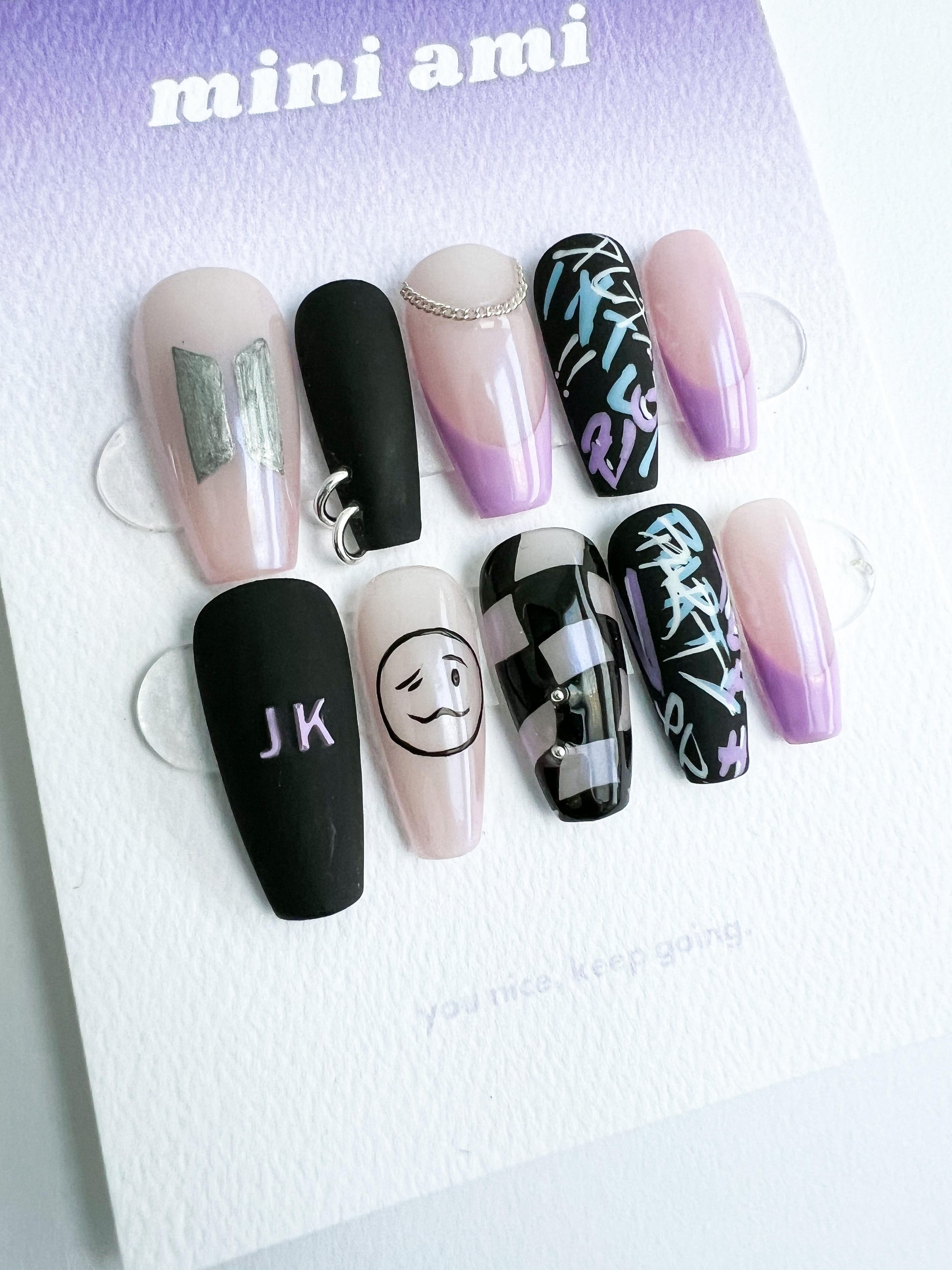 Inspired by Jungkook's love for the colour black, tattoos, and ARMY, rep JK's style with this edgy set. Details include his iconic finger tattoo, "party, party yeah" graffiti nail, and nail piercings.